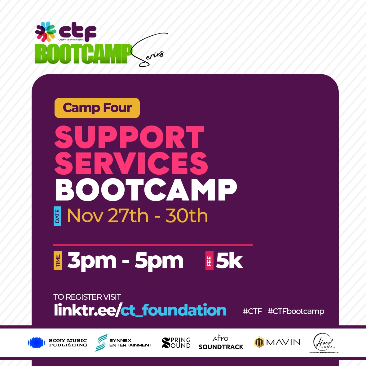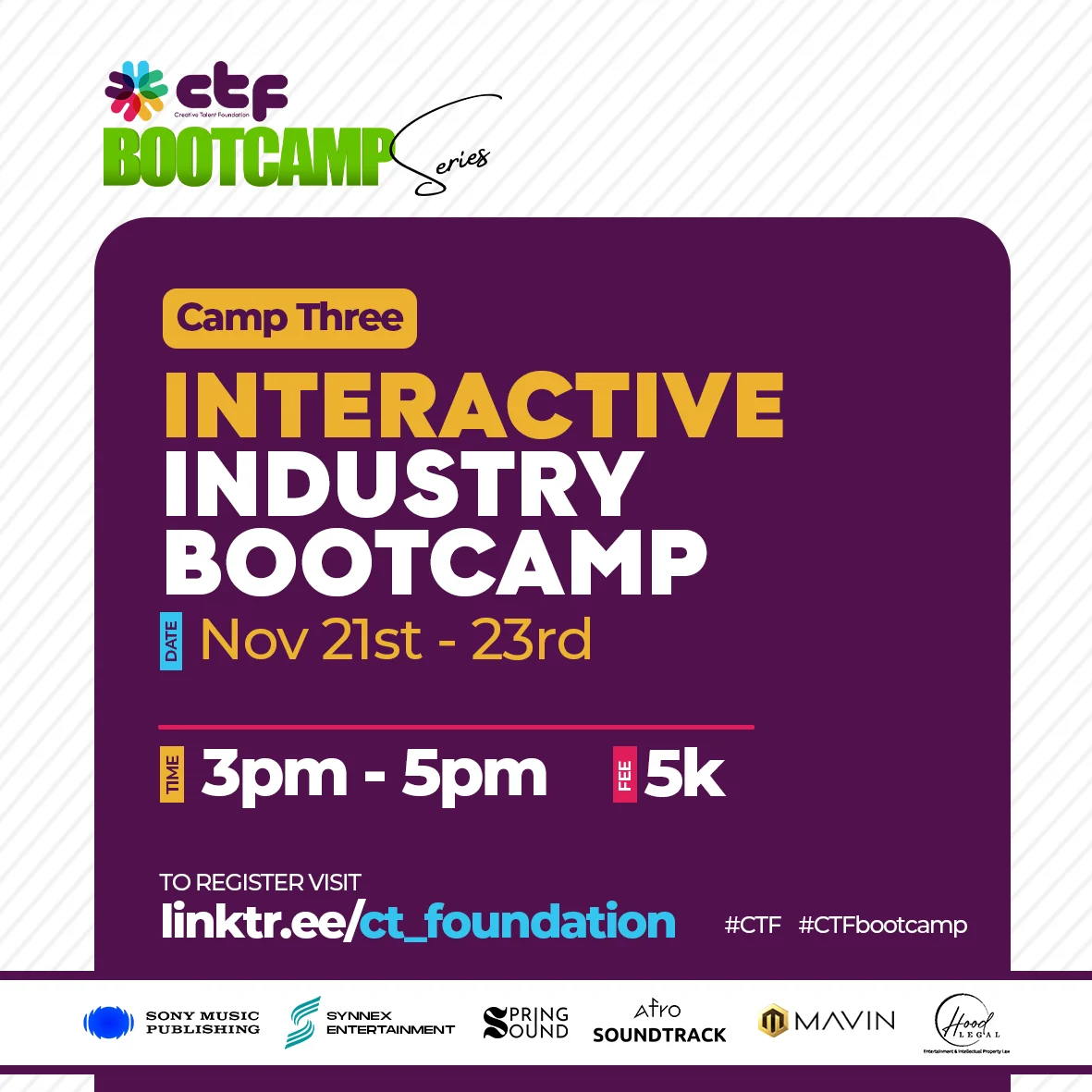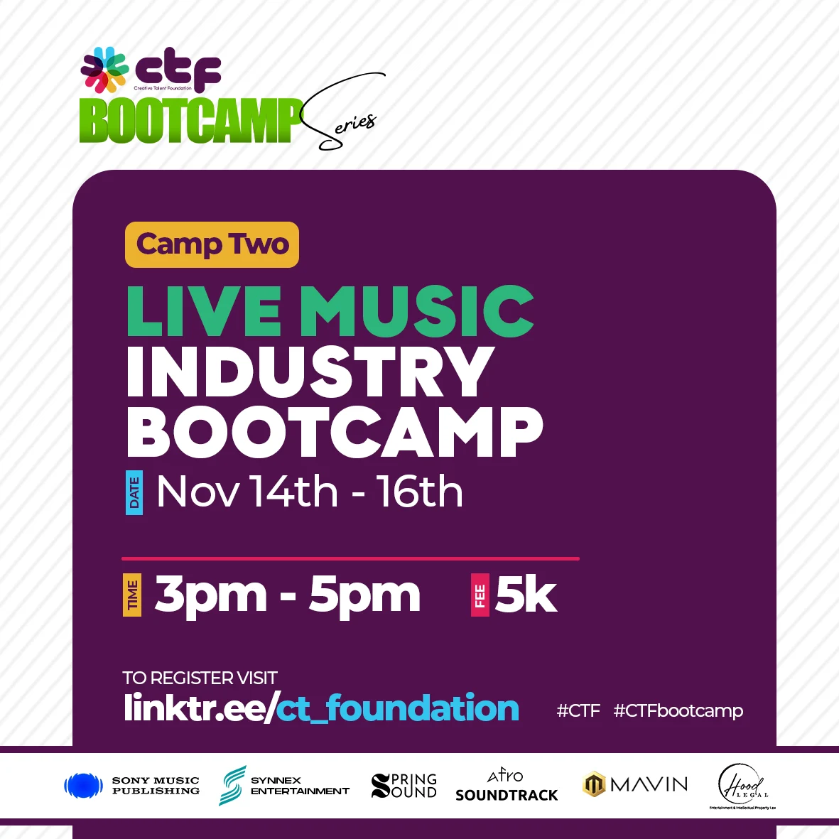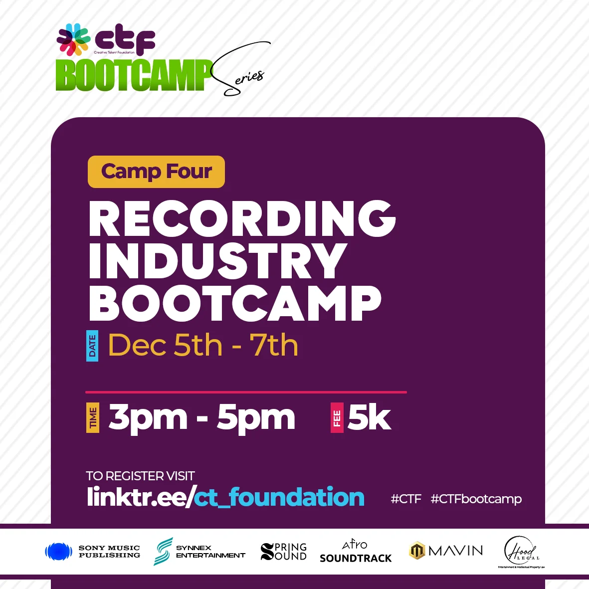 Our Bootcamp series is a programme that provides entry-level training on the five industries of the music business for five weeks. Beneficiaries of the sponsorship funds of the Music Business Academy for Africa will be selected from this programme.